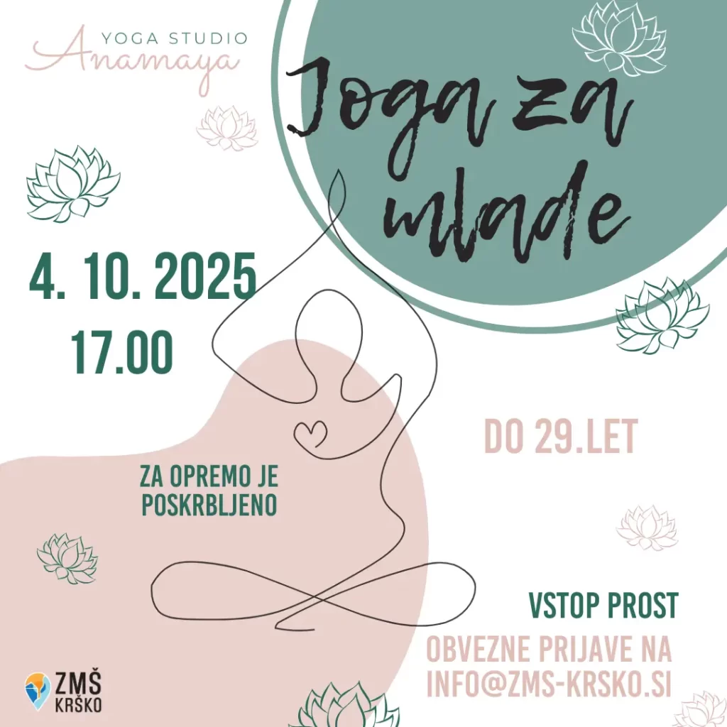 🧘𝗝𝗢𝗚𝗔 𝗭𝗔 𝗠𝗟𝗔𝗗𝗘 🧘 𝗭𝗮 𝗸𝗼𝗴𝗮: mladi do 29. let 𝗞𝗱𝗮𝗷: 4. 10. 2025 Č𝗮𝘀: ob 17.00 𝗢𝗽𝗿𝗲𝗺𝗮: priskrbljeno 𝗖𝗲𝗻𝗮: brezplačno, vendar potrebne prijave na info@zms-krsko.si Pridruži se nam in prisrčni Anji Zorko iz Anamaya studia pri sobotni jogi za mlade, ki bo potekala v Zavodu za mladino in šport Krško. Za opremo in prostor […]